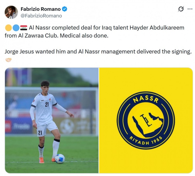 罗马诺透露,利雅得胜利敲定巴格达使者小将海德尔·阿卜杜勒卡里姆,球员已经完成体检,利雅得胜利主帅热苏斯希望签下这位伊拉克球员,俱乐部管理层完成这笔交易。