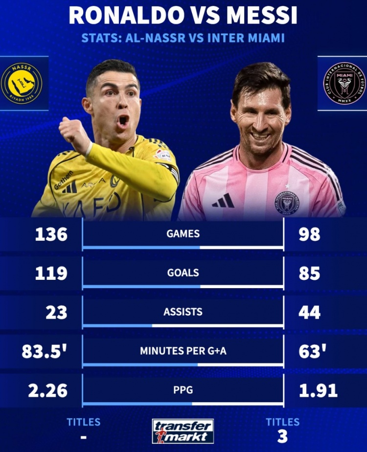 C罗(利雅得胜利):136场,119球、23助攻,每参与1球花费83.5分钟,场均拿分2.26分,0冠(德转未统计阿拉伯俱乐部冠军杯)