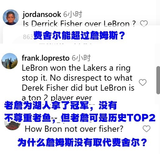 这样的阵容也引起了不少的讨论,评论中不少人认为詹姆斯在湖人效力湖人7个赛季,拿过总冠军、个人表现也非常出色,至少应该可以替代费舍尔进入这个榜单。