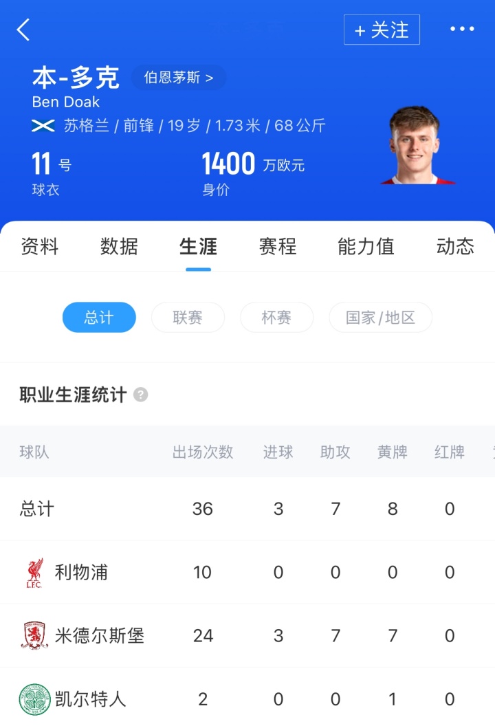 本-多克现年19岁,上赛季被利物浦外租至英冠球队米德尔斯堡,出场24次贡献3球7助,目前他的德转身价为1400万欧元。