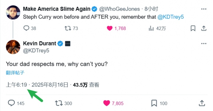 杜兰特6点19分就光速回复说:“你爹都尊重我,为什么你不行?”